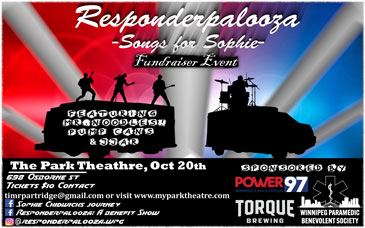 Responderpalooza – Songs for Sophie is a Charity event that will showcase the talent of first responders in Winnipeg (Paramedics & Firefighters) in an effort to raise money for Sophie Chidwick. All music will be covers, not originals.