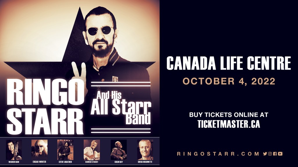 April 11, 2022 – Today Ringo Starr and His All Starr Band – Steve Lukather, Colin Hay, Warren Ham, Gregg Bissonette, Hamish Stuart and Edgar Winter – announce new Canadian shows for 2022 that include a Winnipeg date on October 4, 2022 at Canada Life Centre. Tickets are on sale Tuesday April 12 at 10:00 a.m. at ticketmaster.ca.