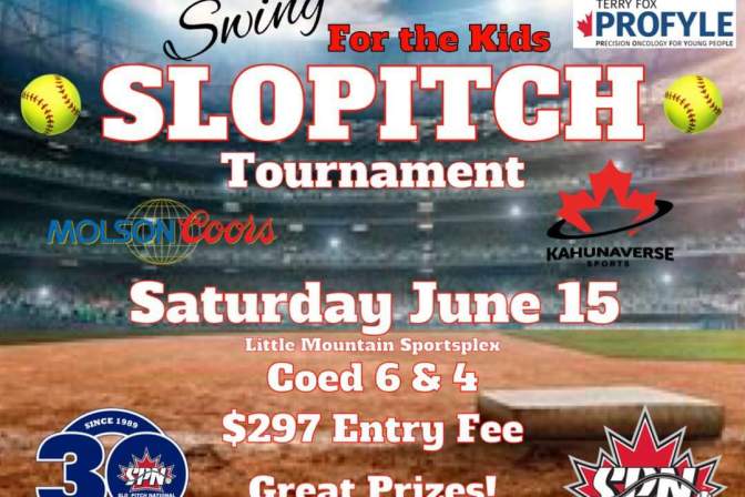Little Mountain Sportsplex Boston Pizza presents the Power 97 Swing For The Kids Slopitch Tournament at Little Mountain Sportsplex on Saturday, June 15th. Co-Ed 6 & 4. $297 Entry Fee. Proceeds to Cancer Care Manitoba Foundation and PROFYLE (Precision Oncology For Young People)