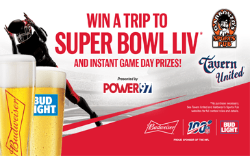 Tavern United Looking for a place to watch the game? Visit your neighbourhood Tavern United for weekly prizes and a chance to win an invite to the Super Bowl Trip Give Away Party in January!