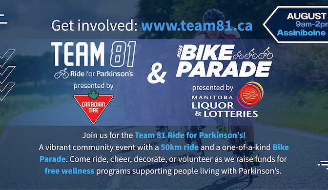 Assiniboine Park, Winnipeg Register today to join the Team 81 Ride For Parkinson’s in Assiniboine Park – a vibrant community event including a 50km cycling route and a one-of-a-kind Bike Parade. Ride, cheer, decorate or volunteer to help raise funds for free wellness programs supporting individuals living with Parkinson’s. Parkinson’s affects over 10 million people worldwide including 100,000 […]